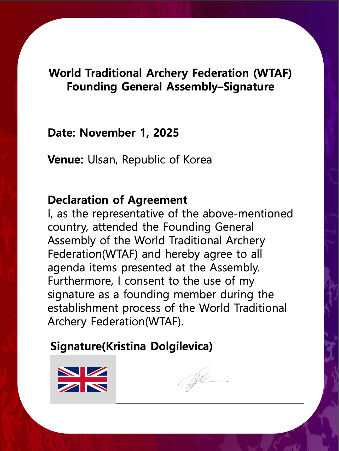 Kristina Dolgilevica (UK-TAIA) will serve as the official representative and a unified voice of UK traditional archers on the global stage. Notably, her role will include facilitating participation in global tournaments (Traditional Archery World Cup, Conquest Cup, World Nomad Games etc) and acting as the spokesperson and representative alongside the rest of the WTAF member nations in any relevant cultural and sporting forums.
